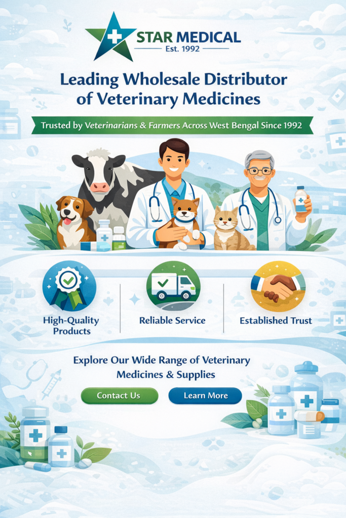 Founded in 1992, Star Medical has been a trusted name in the wholesale distribution of veterinary medicines for over three decades. Based in Katwa, West Bengal, we specialize in providing high-quality veterinary pharmaceuticals to clinics, veterinarians, and animal care professionals. Our mission is to ensure that the veterinary community has access to the best products available, helping them deliver optimal care for animals.